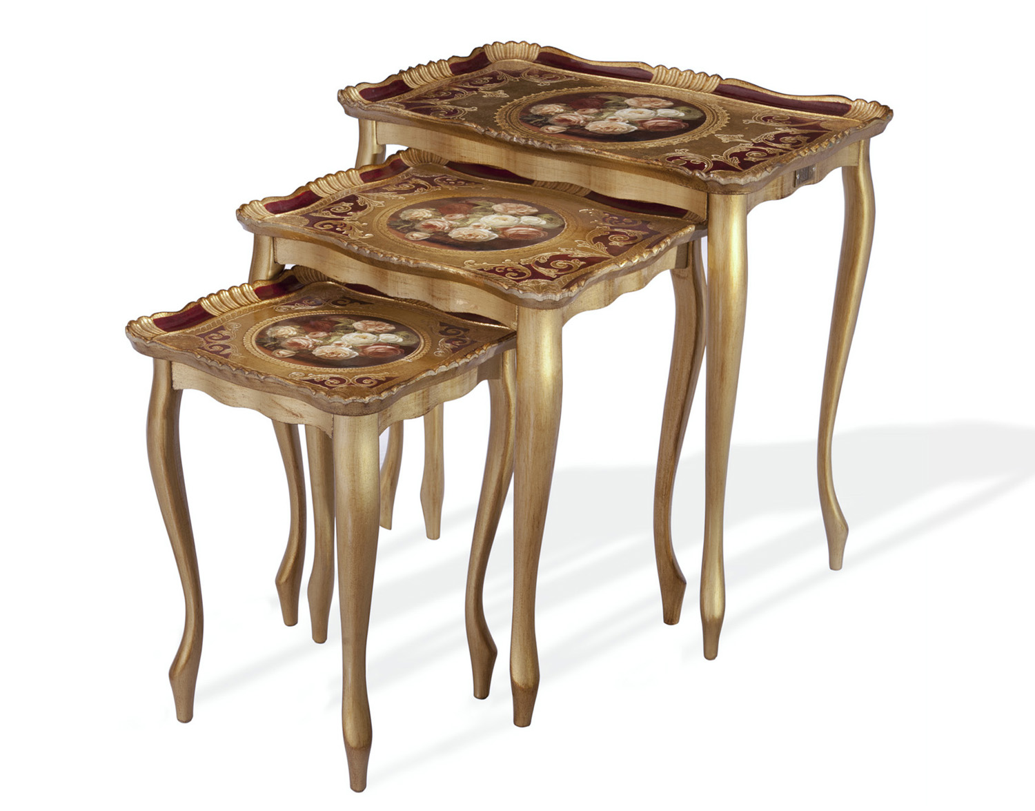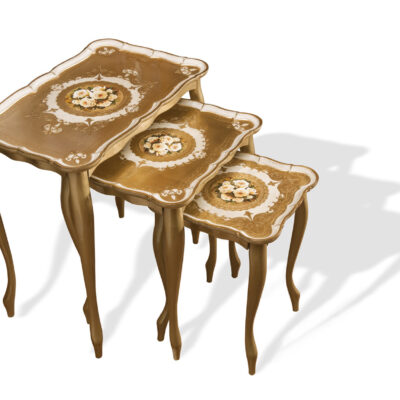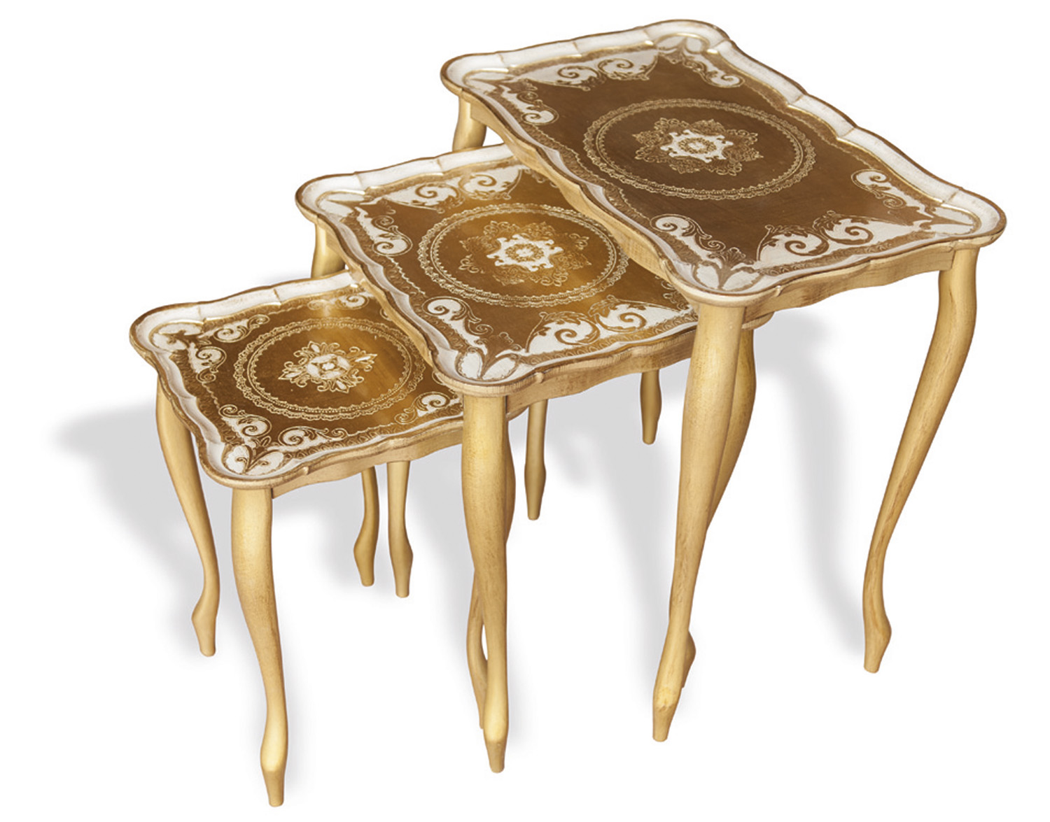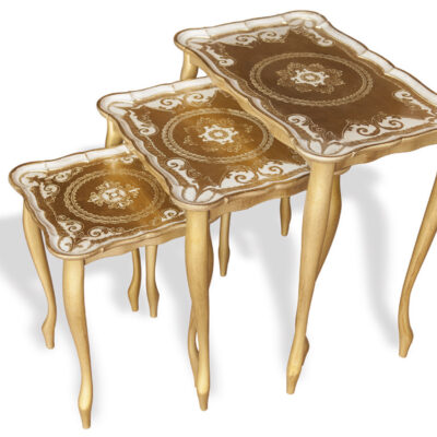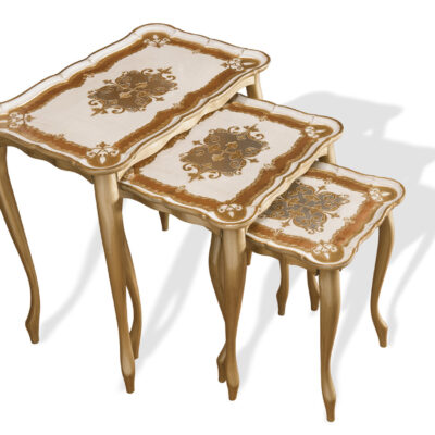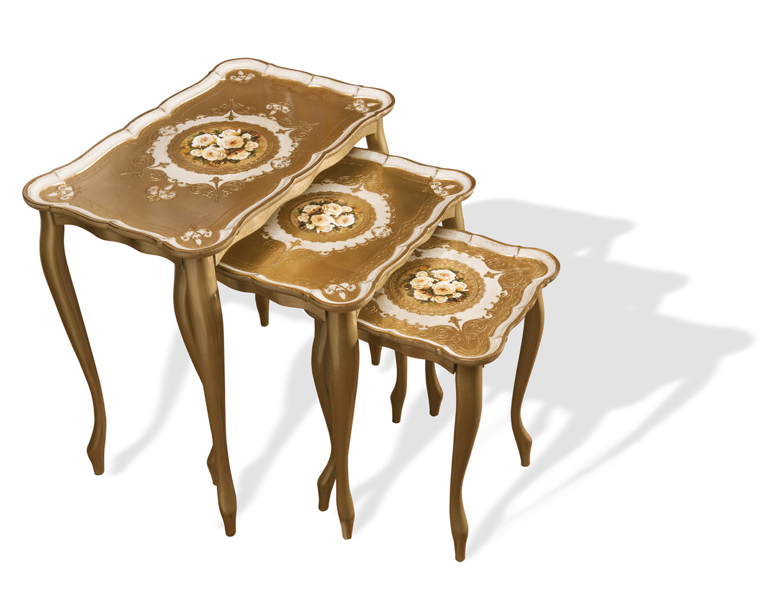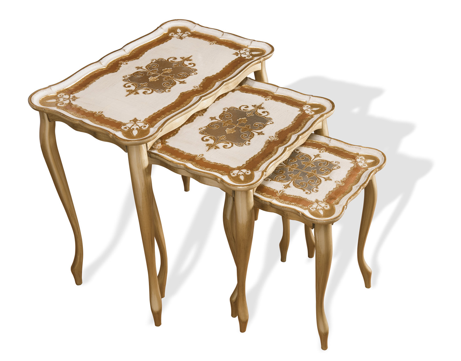 Eleganti tavolini da salotto in legno decorato secondo le antiche tecniche artigianali del ‘300 fiorentino.