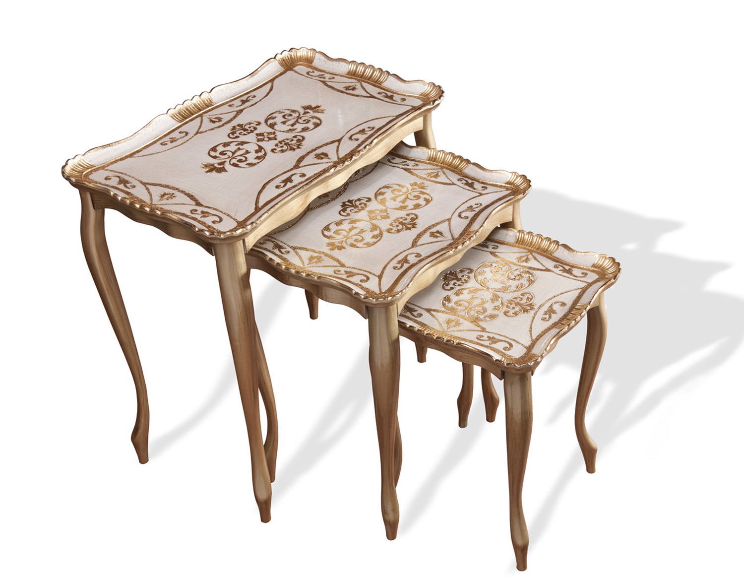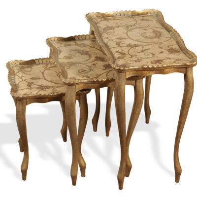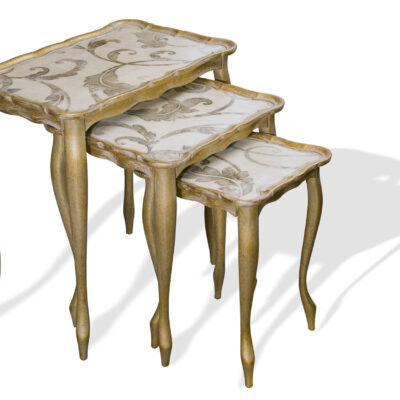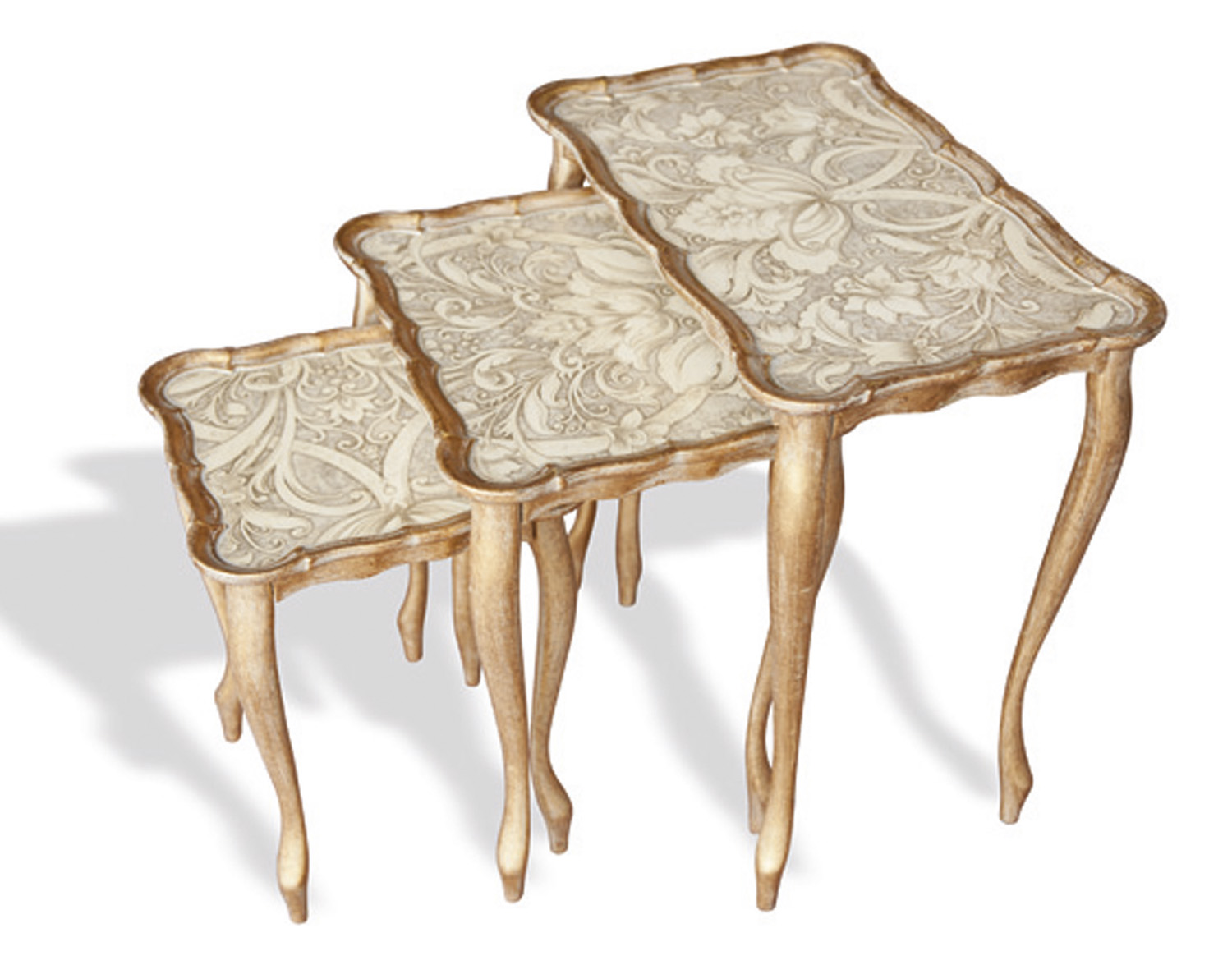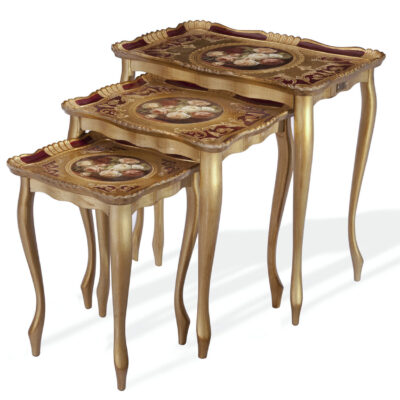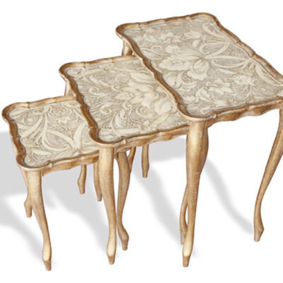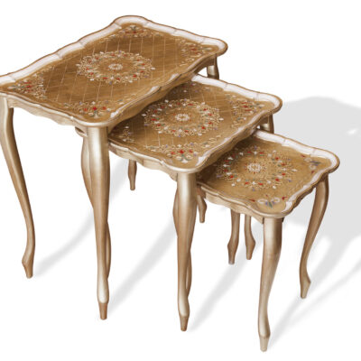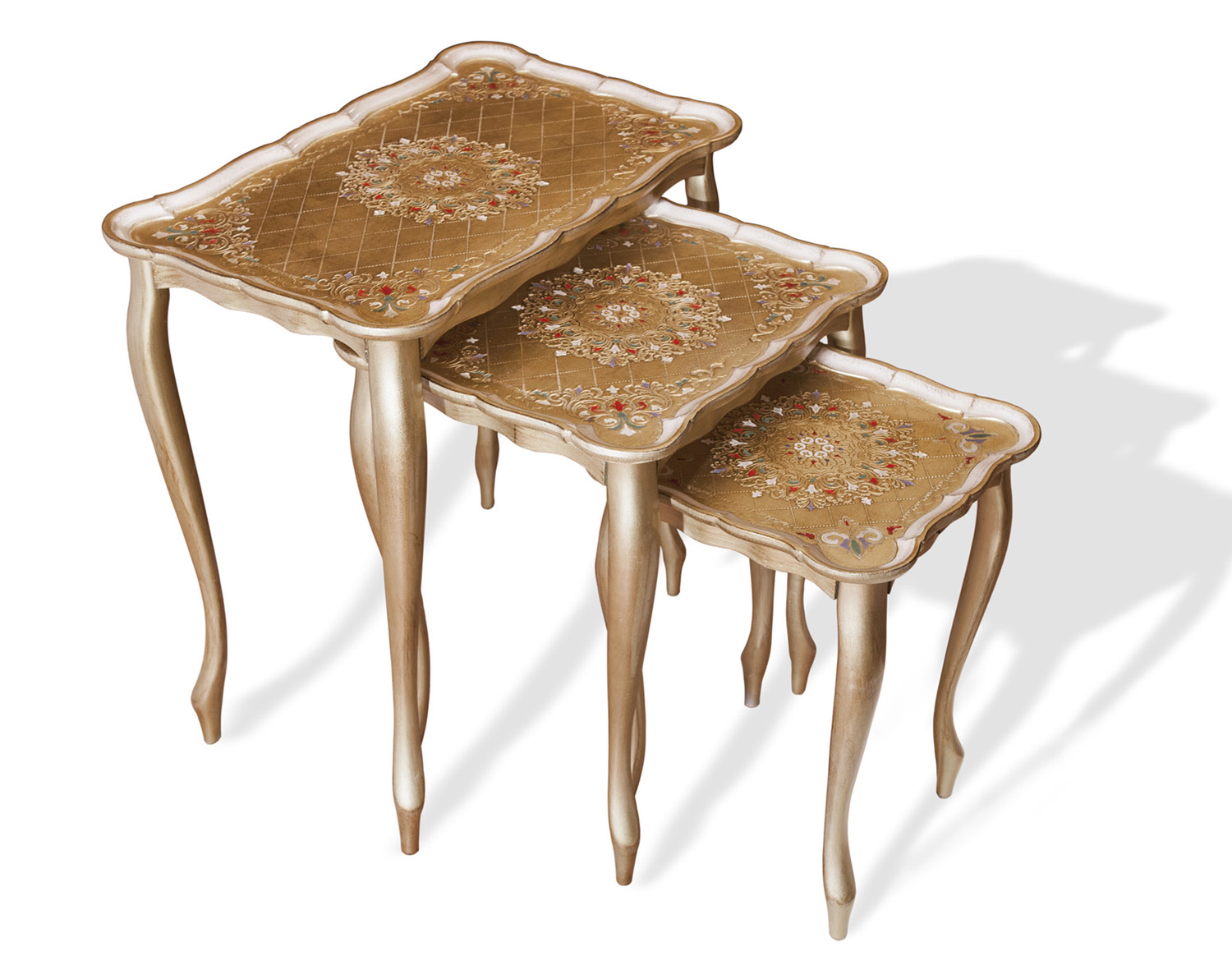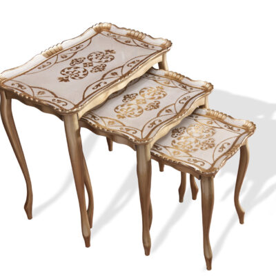 Eleganti tavolini da salotto in legno decorato secondo le antiche tecniche artigianali del ‘300 fiorentino.